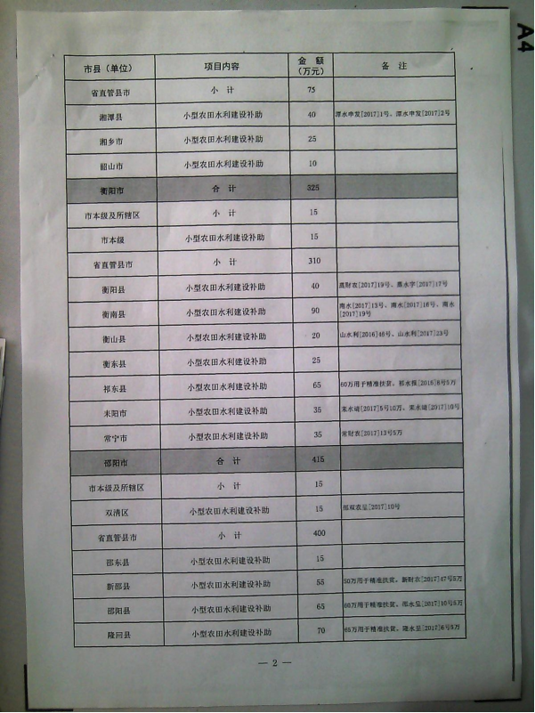 3、小型农田水利建设资金:湘财农指[2017]82号文件下达补助资金40万元,该项目资金将按申报文件安排拨付。